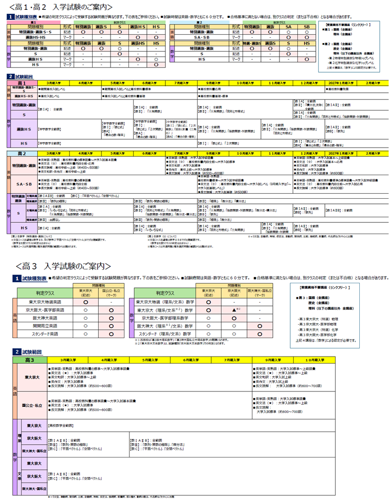 入学試験範囲とレベル Home / 入学案内 / 入学試験範囲とレベル 入学試験範囲とレベル 入学試験の範囲とレベル、および傾向と対策を、学年ごとにご案内いたします。模試認定入学制度もございます。詳しくは「模試認定入学制度」をご覧ください。 試験問題見本は、試験形式の見本です。実際の試験と出題範囲などが異なる場合がございます。試験見本の解答の配付・掲載も行っておりません。ご了承ください。 試験種別・試験範囲 試験種別・試験範囲を見る(PDF) 2026年度入学 試験問題見本 高1 問題見本 英語 特別選抜・選抜S・S 英語 選抜HS・HS 数学 特別選抜・選抜 数学 S 数学 選抜HS 数学 HS 高2 問題見本 英語 特別選抜・選抜 英語 SA・SB 数学 特別選抜・選抜 数学 S 数学 HS 高3 問題見本 英語 東大京大 英語 国公立・私立 数学 東大京大 数学 京大阪大 数学 阪大神大・国私立 高1生「入学試験」受験申込み 高2生「入学試験」受験申込み 高3生「入学試験」受験申込み