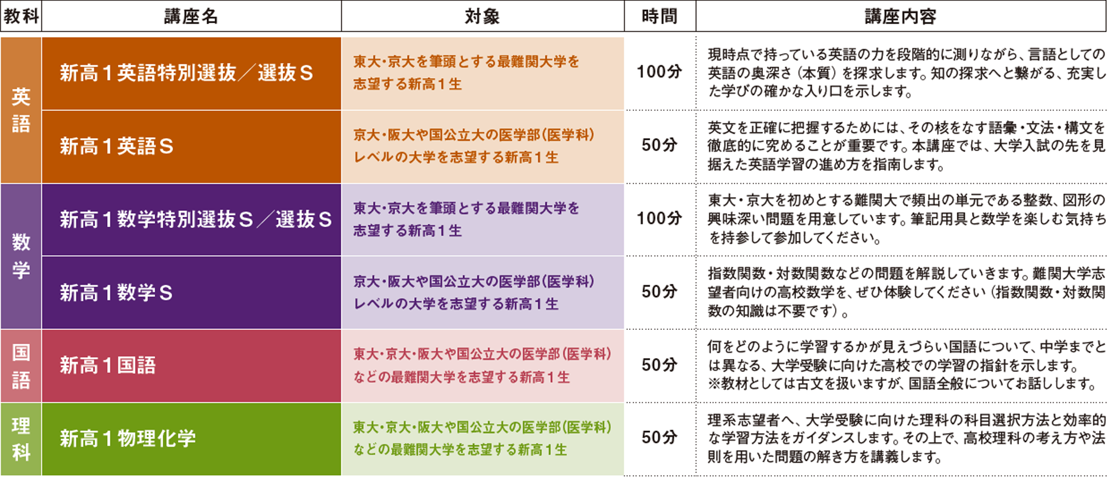 入試で必ず出題されるような新学年の重要単元をじっくり解説、集中的に学習する講座も開講します。重要単元を得点源にし、現役合格に一気に近づく絶好のチャンスです。
