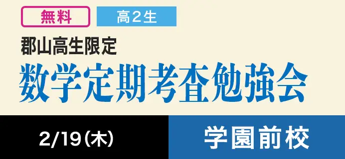 頑張る皆さんを応援すべく、研伸館学園前校にて郡山高校高2生対象の「数学定期考査勉強会」を実施します。普段、研伸館にお通いでない方も参加できるイベントとしておりますので、気軽に足を運んでください。