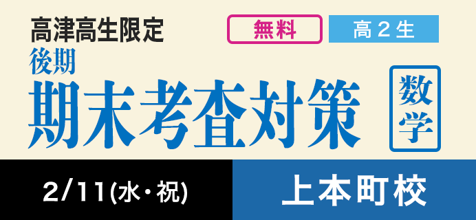 頑張る皆さんを応援すべく、研伸館上本町校にて高津高校高2生対象の「後期期末考査対策(数学)」を実施します。普段、研伸館にお通いでない方も参加できるイベントとしておりますので、気軽に足を運んでください。