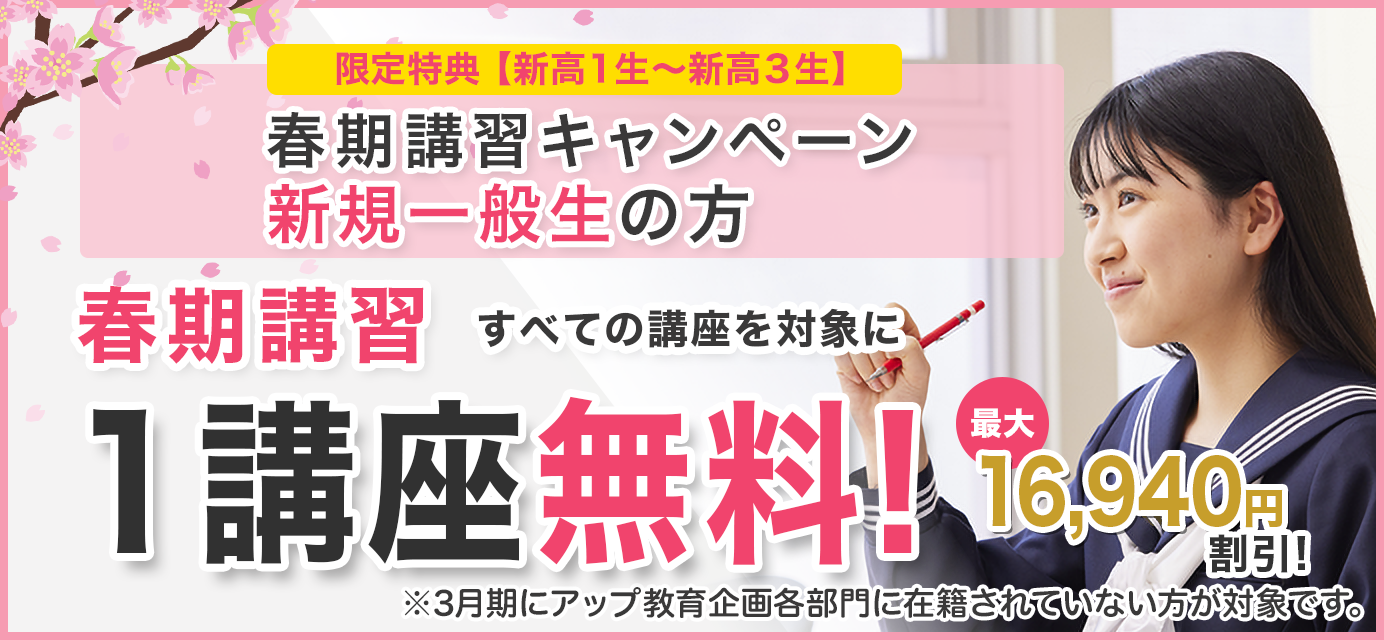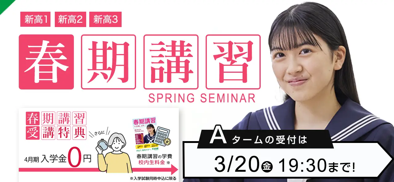 | 受講特典 | ①春期講習受講生は、4月入学金が無料となります。 ②3月期までの入学生は、春期講習を校内生料金で受講できます。 |